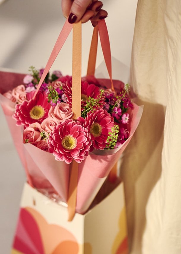 This gift includes premium pink spray Waitrose Foundation Roses and cerise Germini mixed with fresh greenbell and soft pink Dianthus.