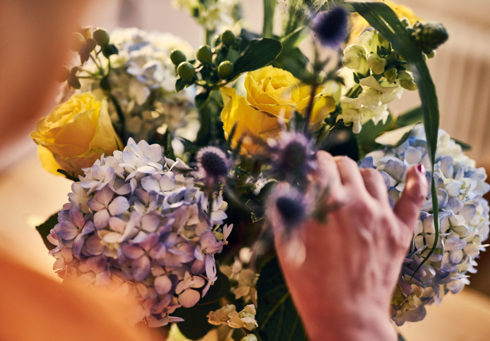 Striking Blue Hydrangeas mixed with soft yellow Foundation roses, white Antirhinum and Hypericum Berries, striking blue Eryngium and delicate grass foliages, gift wrapped in No.1 cello and tissue with No.1 gift tag.