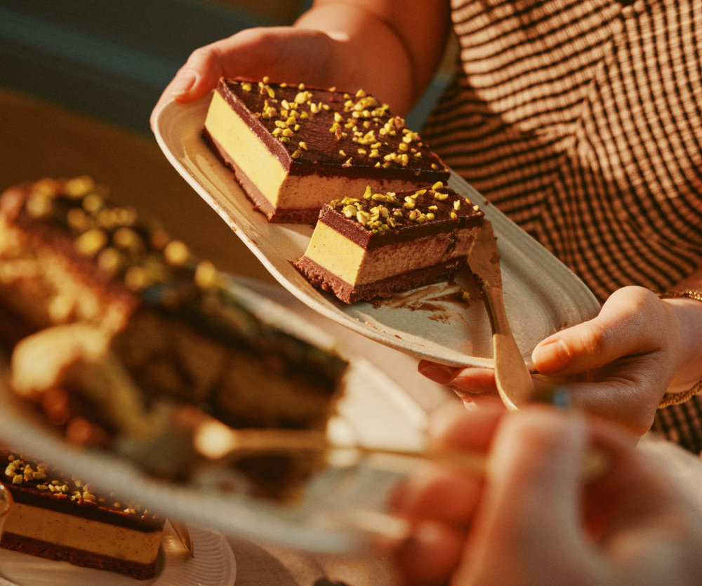 Our No.1 Chocolate & Pistachio Torte is inspired by the Dubai chocolate bar that's become a social media sensation. Smooth, velvety pistachio and white chocolate mousse contrasts with a crunchy base of milk chocolate feuilletine with a pinch of salt, and it's finished with a silky dark chocolate ganache and a sprinkling of pistachios. Fairtrade sourced cocoa - mass balance. Visit info.fairtrade.net/sourcing.